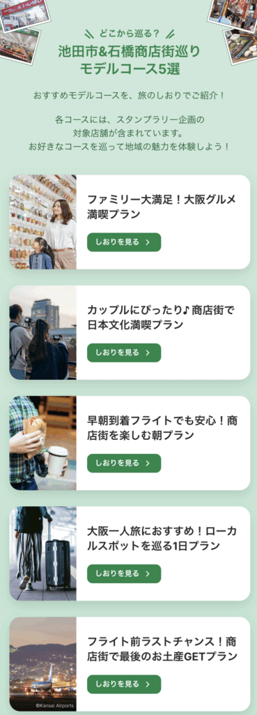 大阪・伊丹空港から梅田や難波へ向かう旅行客は非常に多いものの、空港との間にある石橋商店街は、“空港から繁華街へ一直線”になりがちな動線の中で、「ちょっと寄り道してもらう仕掛け」を求めていました。また、カップヌードルミュージアムをはじめ周辺には個性的な集客拠点も点在。そこで当社は、商店街ならではの温かみとデジタルの利便性を融合させた スタンプラリー付き特設ページ を Sassy 上に開発しました。